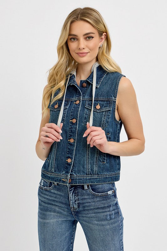 Layer up in style with the Risen Denim Vest With Hood — a fresh twist on a timeless classic. This versatile piece features a structured denim vest body with an attached soft hood, giving you the perfect mix of rugged edge and laid-back comfort. Designed with button-front closure and chest pockets, it's easy to layer over graphic tees, flannels, or sweaters for an effortlessly cool vibe.
