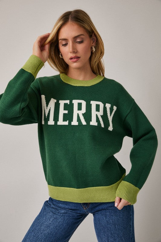 Bring a little holiday cheer to your wardrobe with the Cathy Crew Neck Merry Sweater. Crafted from soft, cozy knit fabric, this festive pullover features a bold "MERRY" graphic across the front — perfect for celebrating the season in comfort and style. The relaxed fit, classic crew neckline, and ribbed trim make it easy to pair with jeans, skirts, or leggings for all your cozy winter moments.