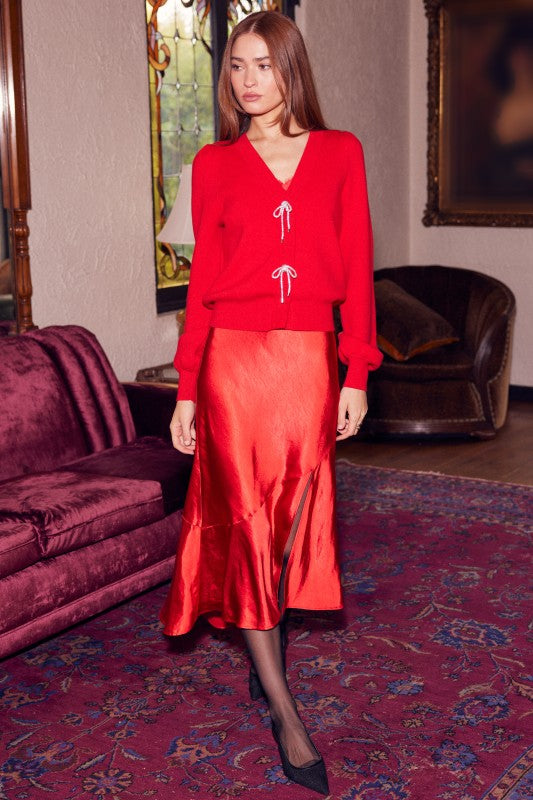 Elegant and feminine, the Rachel Ribbon Trim Cardigan in Red adds a timeless touch to your cozy-weather wardrobe. Crafted from soft knit fabric, this cardigan features delicate ribbon trim detailing that adds a refined, classic finish. The button-front design and slightly cropped fit make it easy to style with high-rise denim, skirts, or layered over dresses for a polished, versatile look.