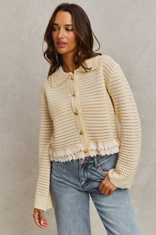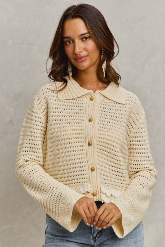 Cozy texture meets effortless style in the Izzy Textured Button Down Sweater. Crafted from soft, mid-weight knit fabric, this sweater features a unique textured pattern that adds dimension and charm to your look. The button-down front allows for versatile styling — wear it open as a cardigan or buttoned as a cozy top. With its relaxed silhouette, ribbed trim, and everyday comfort, it's the perfect piece for transitioning between seasons or layering up.