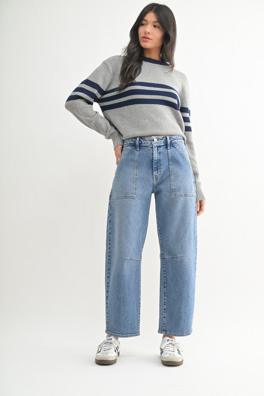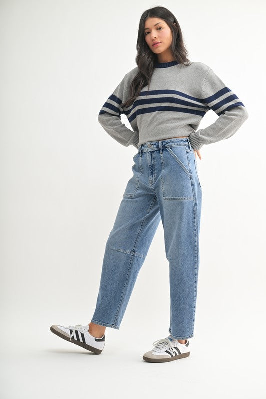 The Abby Utility Seamed Barrel Jeans by JBD bring a bold, modern twist to everyday denim. Designed with a trending barrel-leg silhouette, these jeans feature subtle utility-inspired seaming that adds structure and visual interest. The mid-to-high rise waist creates a flattering shape, while the relaxed leg offers effortless comfort and a fashion-forward vibe. Crafted from soft, durable denim with just a touch of stretch, they're perfect for pairing with fitted tops, sweaters, or graphic tees for an elevated casual look.