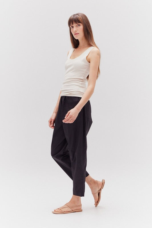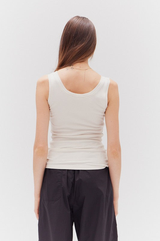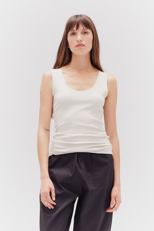 A closet essential with endless versatility. The June Ribbed Tank features a flattering scoop neckline, wide straps, and a softly fitted silhouette in a stretchy ribbed knit. Its ultra-soft fabric and classic natural hue make it the perfect layering piece or stand-alone staple.
