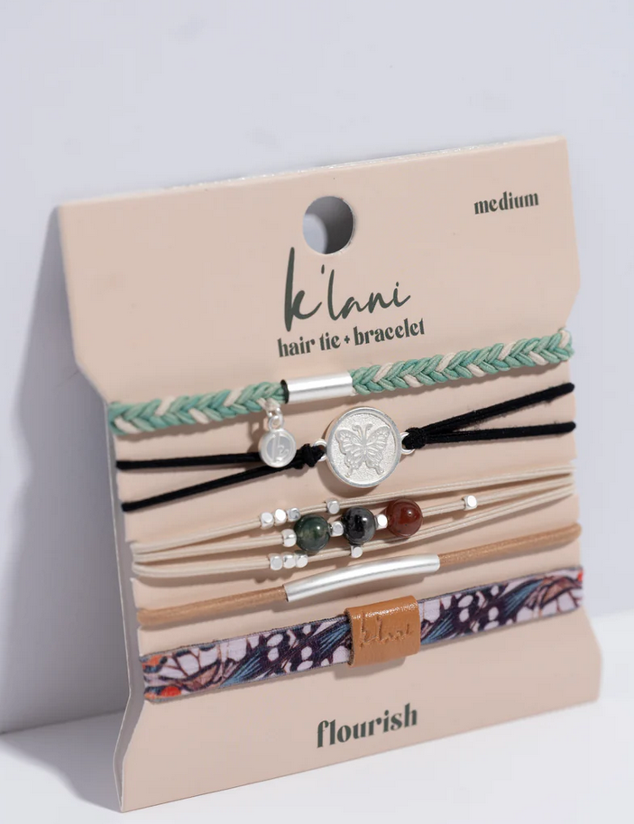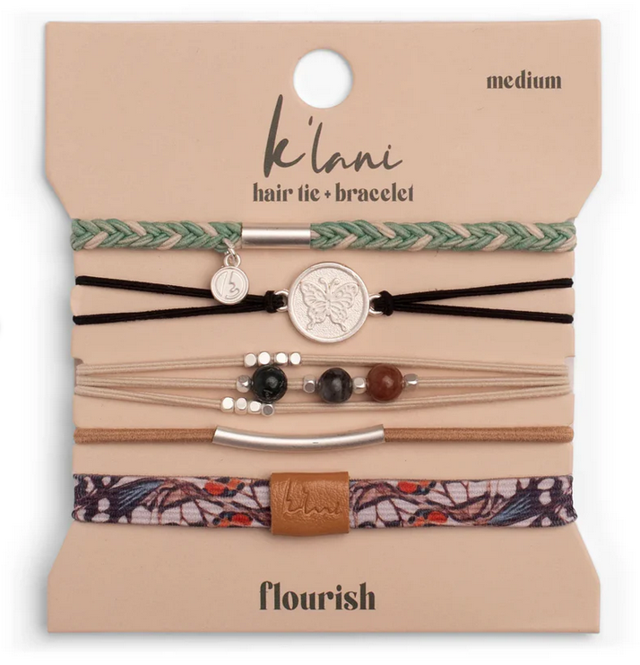 The K'Lani Flourish Hair Tie Bracelet is where beauty meets function. Designed to be worn as a stylish bracelet or a strong, gentle hair tie, it features an elegant beaded design that adds a touch of charm to any look. The durable elastic keeps your hair secure without snagging or causing creases, making it perfect for everything from busy workdays to weekend adventures.