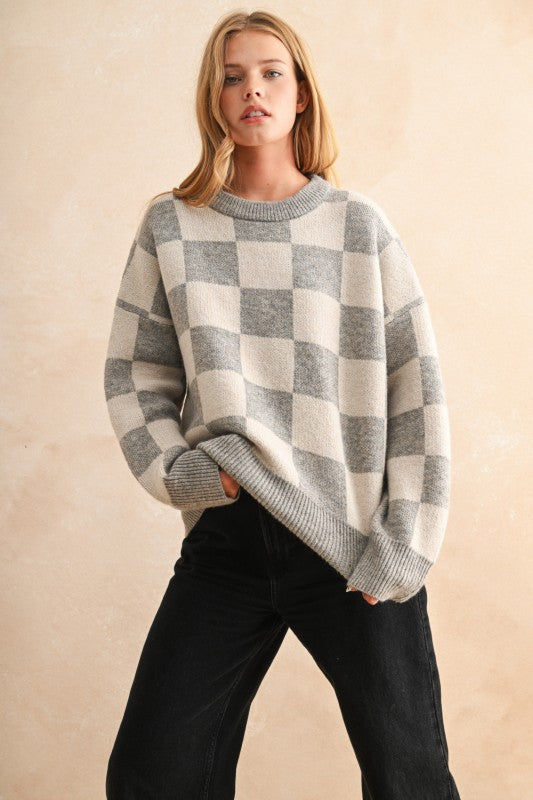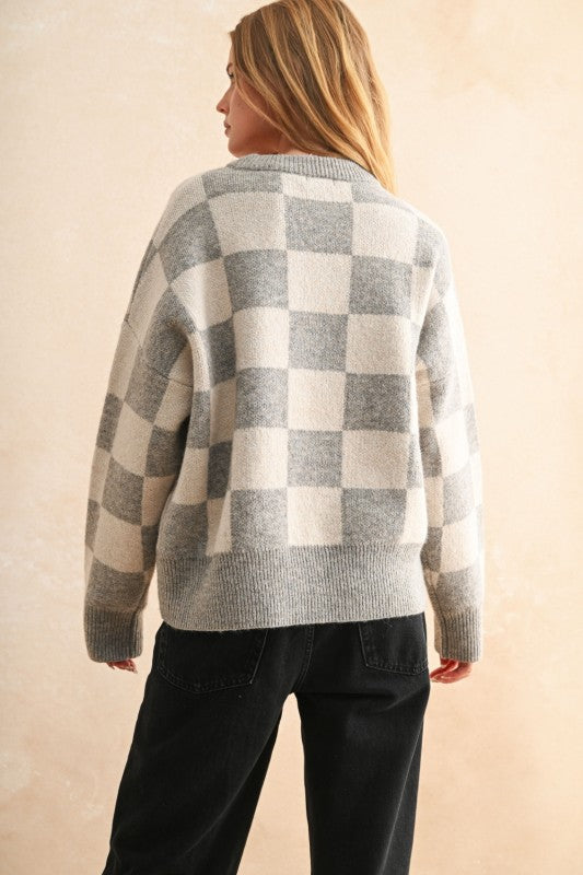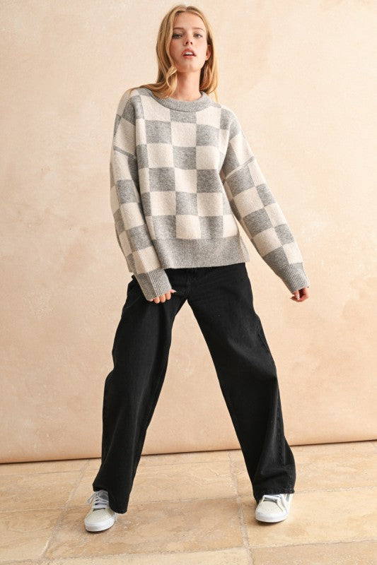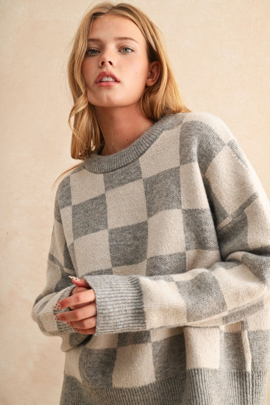Effortlessly cool and endlessly versatile, the Mikayla Checkered Pattern Sweater brings a fresh edge to classic comfort.