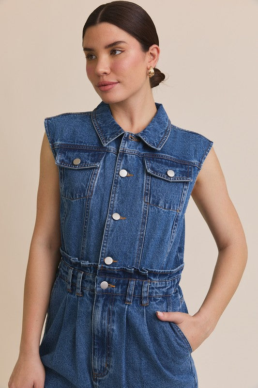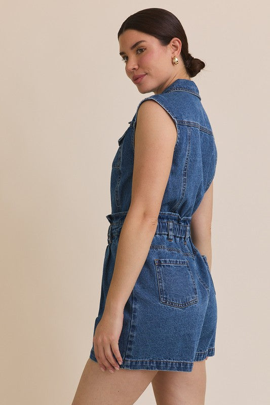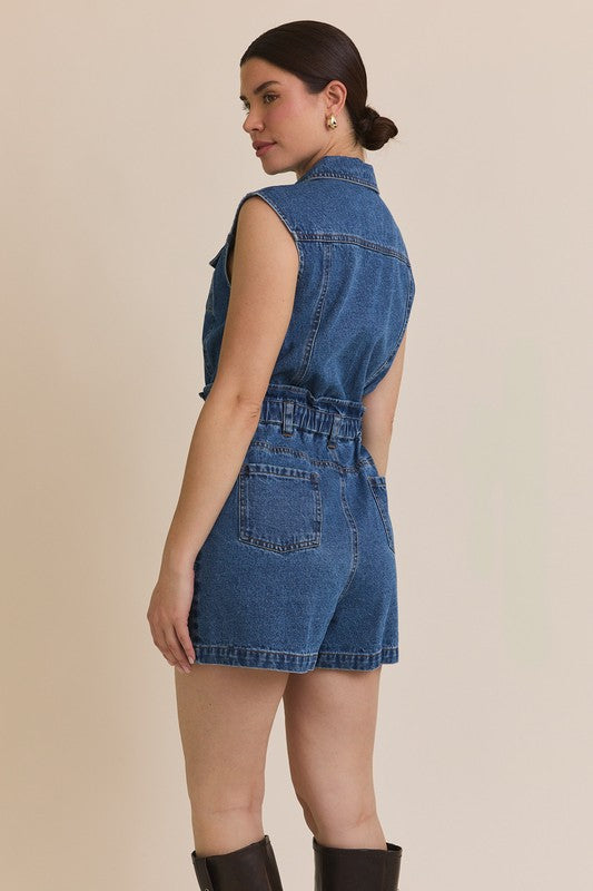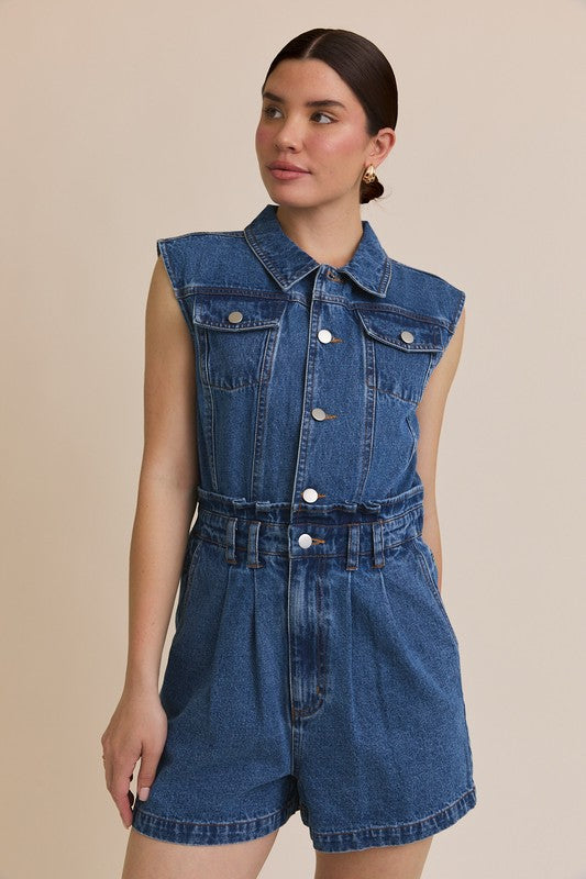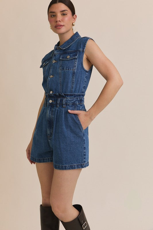 All the edge of denim with the ease of a romper — meet the Reagan Sleeveless Denim Romper. This one-piece wonder is made from soft, structured denim and features a sleeveless button-up bodice, flattering high waist with cinched belt loops, and relaxed-fit shorts for a confident, vintage-inspired silhouette.