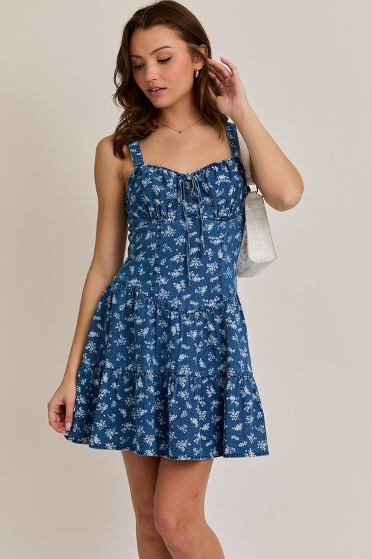 urn heads in the Rylie Floral Denim Mini Dress — the perfect blend of sweet and sassy. This lightweight denim dress features a dainty white floral print, a flattering sweetheart neckline with front tie detail, and wide straps for a feminine yet secure fit. The fitted bodice flares into a flowy, tiered skirt for a flirty silhouette that moves with you.