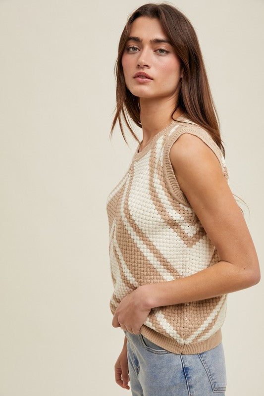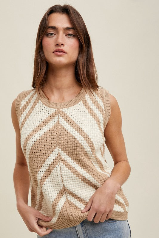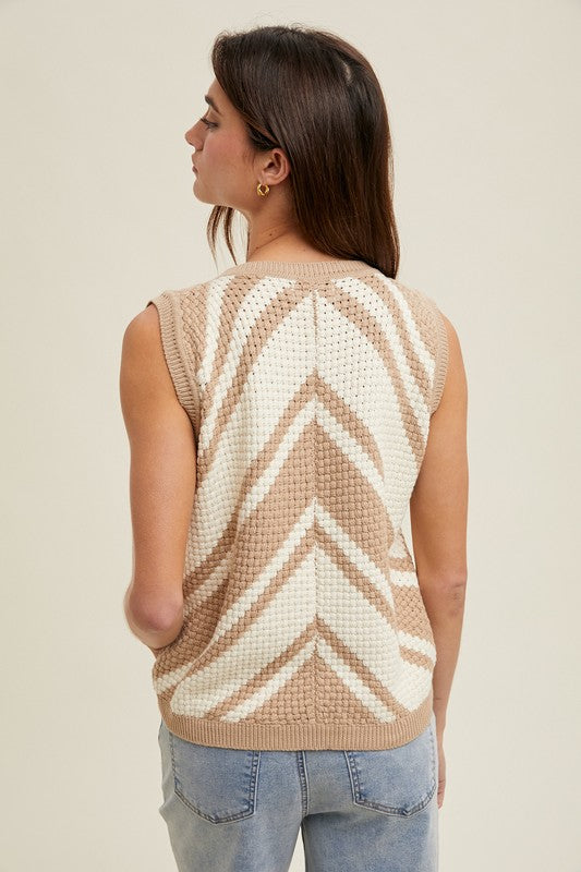 Bold, textured, and full of retro charm — the Sawyer Chevron Knit Sweater Vest makes a statement while keeping things effortlessly wearable. Featuring a chunky, open knit design in warm neutral tones, the bold chevron pattern adds a vintage-inspired vibe that's perfect for layering or styling solo. The crew neckline, sleeveless cut, and slightly relaxed fit give it easy, everyday versatility.